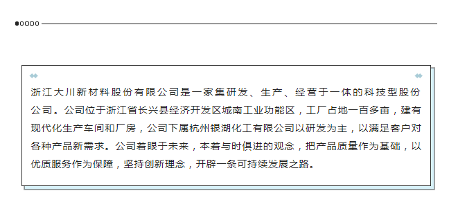 浙江大川新材料股份有限公司 辦公地址:浙江杭州天目山路224號(hào)中融城市花園 投訴熱線:0571-85028946 技術(shù)服務(wù)熱線: 0571-85028548 郵箱:yinhuchem@yinhuchem.com